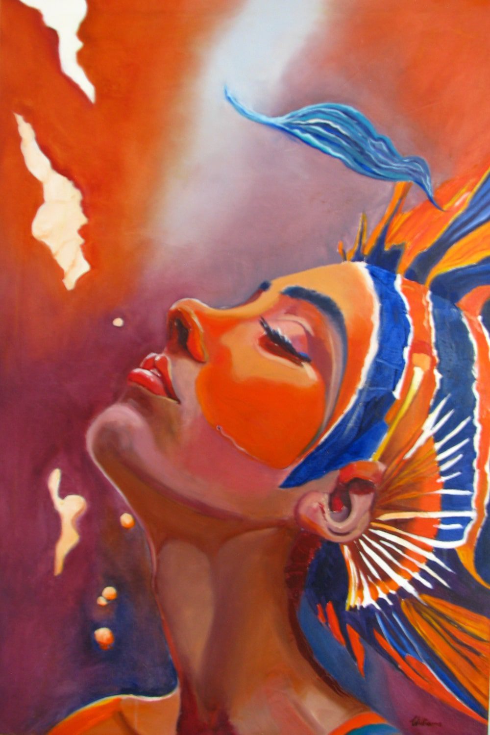 W tej niezwykłej pracy kobiecość spotyka się z tajemnicą głębin. Kobieta o długiej, smukłej szyi, której głowa przechodzi płynnie w kształt ryby, staje się symbolem przenikania światów – tego, co widzialne i niewidzialne, codzienne i magiczne. Jej piękno jest spokojne, niemal eteryczne, a spojrzenie zaprasza do zanurzenia się w marzenia.